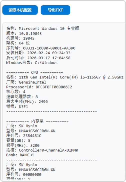 • 点击“读取本机配置”获取信息