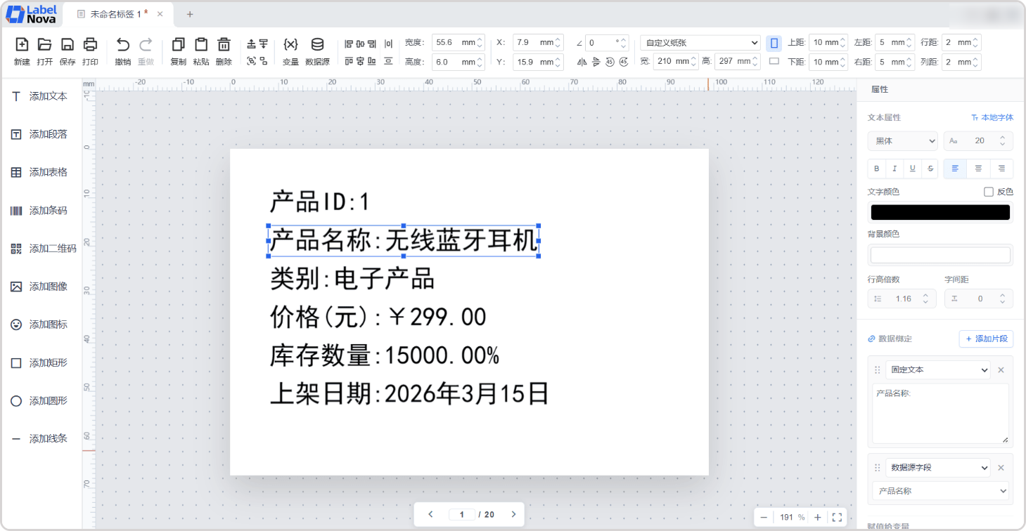 • 支持表格:支持合并拆分单元格、插入行列、单元格独立绑定字段,复杂标签也能轻松搞定