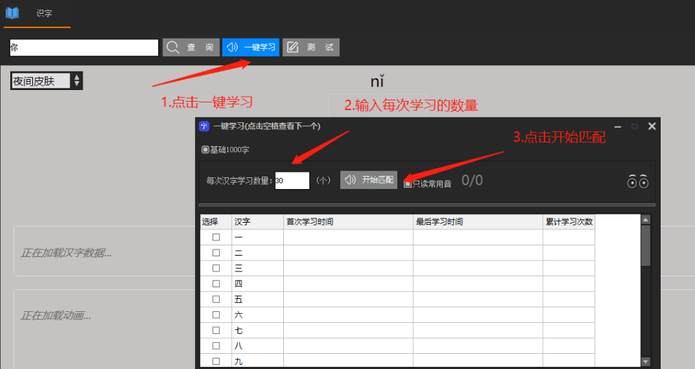 1.点击一键学习 内置了1000个很常用的字 给他学习