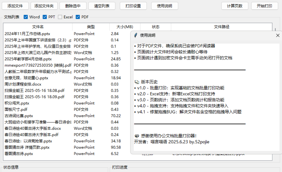 办公文档批量打印器 是一款专为Windows办公环境设计的高效文档打印工具。该软件支持Word、PowerPoint、Excel(v2.0)、PDF四种主流文档格式的批量打印,通过直观的图形界面让用户轻松管理大量文档的打印任务。