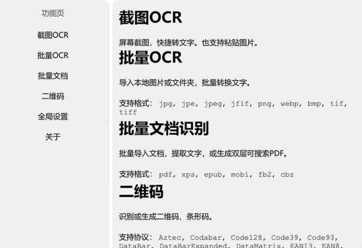 功能:截图OCR / 批量OCR / PDF识别 / 二维码 / 公式识别