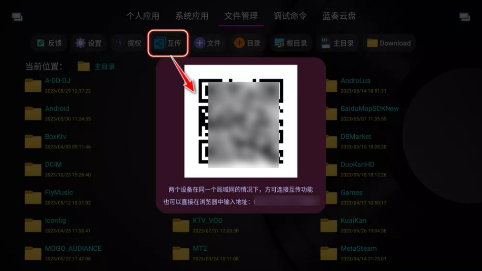 局域网文件互传功能,这个功能在文件管理里面,手机扫码之后,可以将手机上下载的APP传送到电视进行安装;也能传送其他文件到电视。