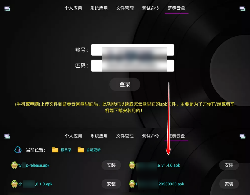 这个功能算比较新颖,软件支持登录自己的蓝奏云网盘,然后你就可以直接下载安装里面的APP文件,很方便,但前提你要先将文件保存到你的蓝奏云网盘。