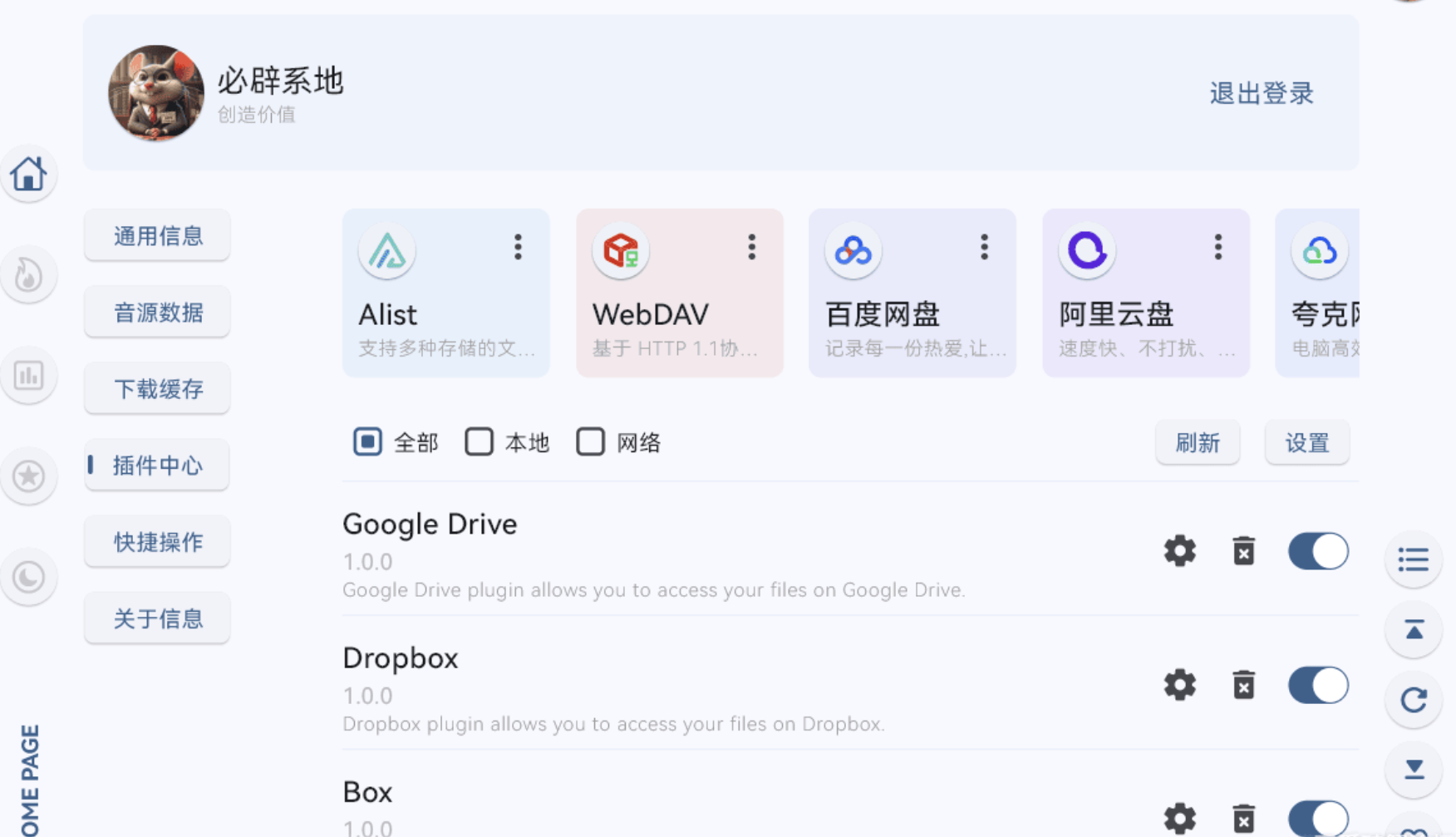 目前支持Alist、WebDAV、百度网盘、阿里云盘、123网盘、夸克网盘、115网盘等